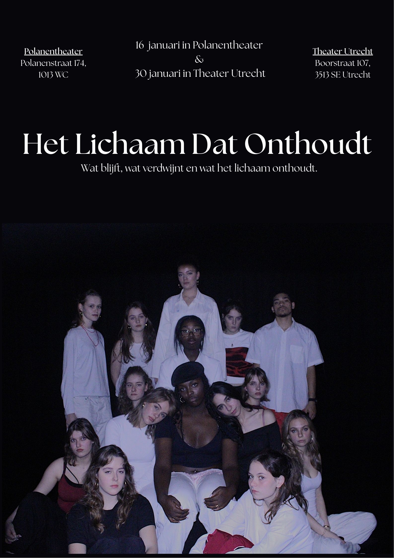 Presentatie van een voorstelling door leerjaar 2 van de PACT+ Theateropleiding als onderdeel van het vak ‘Spelen onder regie’ ism de Hogeschool voor de Kunsten Utrecht. Het Lichaam Dat Onthoudt Wat blijft, wat verdwijnt en wat het lichaam onthoudt. Locatie: Polanentheater Ticketverkoop: https://shop.weeztix.com/aebd3e07-da76-11f0-a9cb-7e126431635e