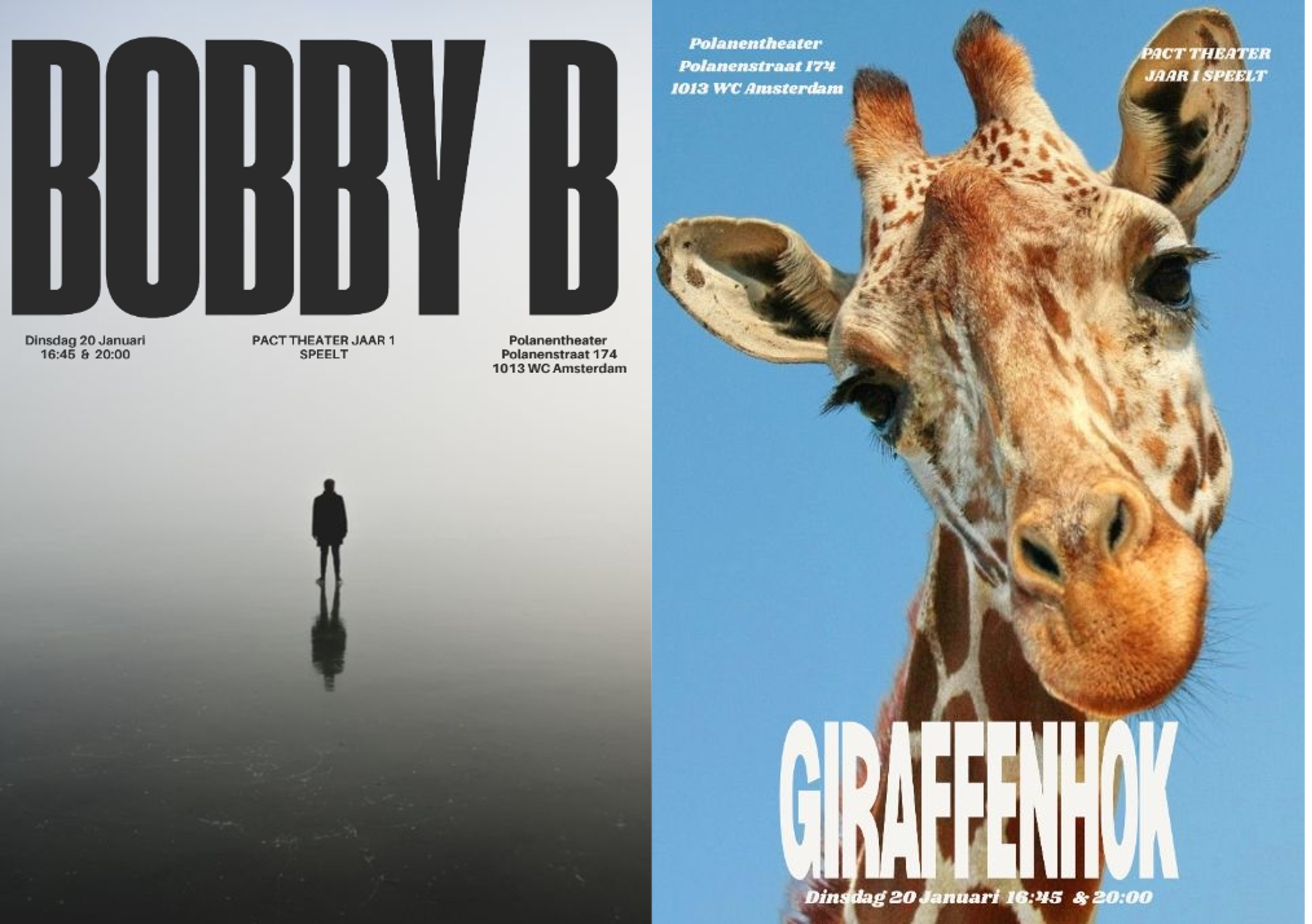Presentatie van twee voorstellingen door leerjaar 1 van de PACT+ Theateropleiding als onderdeel van het vak ‘Spelen onder regie’. BOBBY B: Tijdens een hereniging confronteert een vriendengroep zich vijftien jaar na een traumatische gebeurtenis met verzwegen waarheid, schuld en onverwerkt verleden wanneer één van hen ontbreekt. GIRAFFENHOK: Een vergadertraject over een nieuw giraffenhok ontspoort door persoonlijke belangen, waardoor het project zelf verdwijnt en de menselijke vergadercultuur wordt genadeloos geparodieerd. Locatie: Polanentheater Ticketlink: https://shop.weeztix.com/d611d236-6556-42dc-87fc-3b2bdee3d01a lees meer
