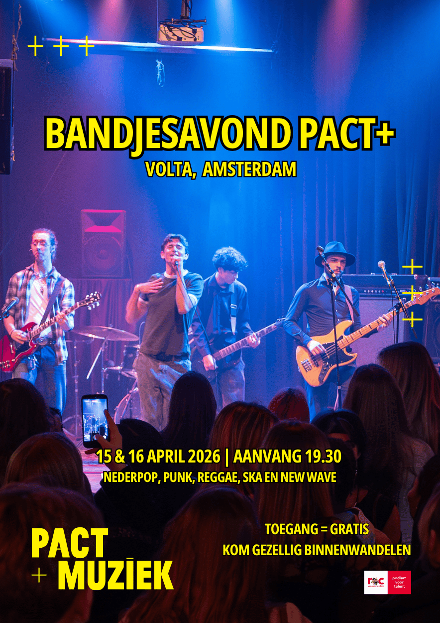 PACT+ Amsterdam is dé plek voor jong creatief talent dat wil doorstromen naar een carrière in de podiumkunsten. Bij PACT+ volg je een creatieve mbo-artiestenopleiding in dans, theater, muziek of music production, allemaal onder één dak. In een kleinschalige en veilige leeromgeving werk je samen met andere talentvolle performers en makers, met veel persoonlijke aandacht en begeleiding. Onze mbo-opleidingen in performing arts zijn praktijkgericht en worden verzorgd door ervaren docenten die zelf actief zijn in het werkveld. Je werkt aan echte producties, bouwt podium- en studio-ervaring op en ontwikkelt een sterk portfolio in het culturele hart van Amsterdam. Zo vergroten we jouw kansen op succes in de creatieve sector. Niet voor niets stroomt maar liefst 40% van onze studenten door naar een hbo-kunstopleiding of het Conservatorium. Of je nu droomt van het podium, de studio of het creatieve maakproces achter de schermen: bij PACT Amsterdam ontwikkel je je tot performer, artiest of creatieve maker. Na de middelbare school is dit dé mbo-opleiding waar jouw passie centraal staat en waar jouw creatieve toekomst begint. Ontdek jouw talent bij PACT+ Amsterdam, bekijk onze mbo-opleidingen in dans, theater, muziek en music production en meld je aan voor het nieuwe studiejaar. 👉 Durf te kiezen voor jouw passie. Durf te kiezen voor PACT+.